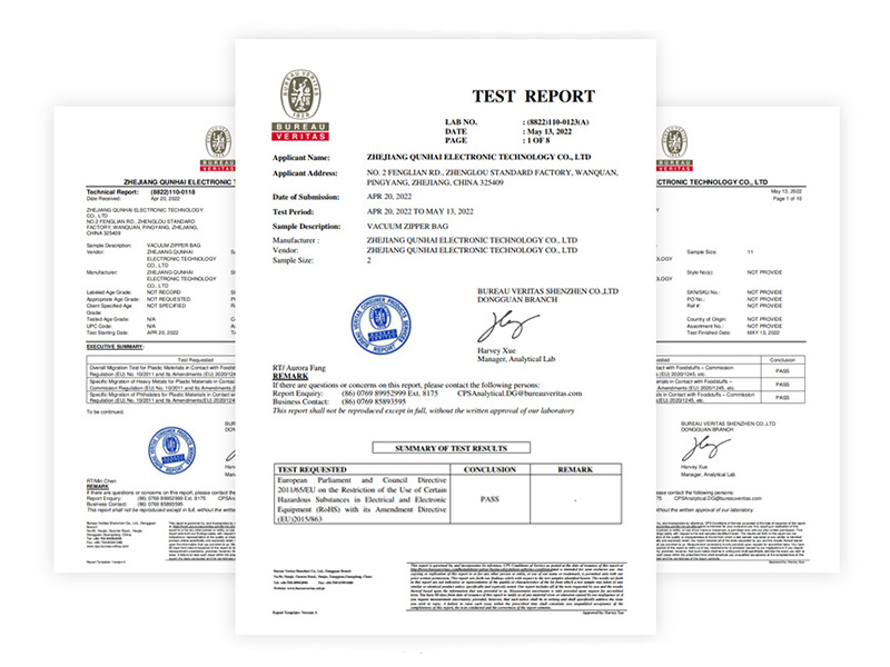 Η εταιρεία μας έχει περάσει με επιτυχία τις δοκιμές επαφής με τρόφιμα για BPA σύμφωνα με τις απαιτήσεις της Ευρωπαϊκής Ένωσης, της Γερμανίας, της Γαλλίας και της Ιταλίας. Έχουμε επίσης περάσει με επιτυχία τις δοκιμές που διεξήγαγε ο FDA των ΗΠΑ, η RoHS της ΕΕ και η RACH.