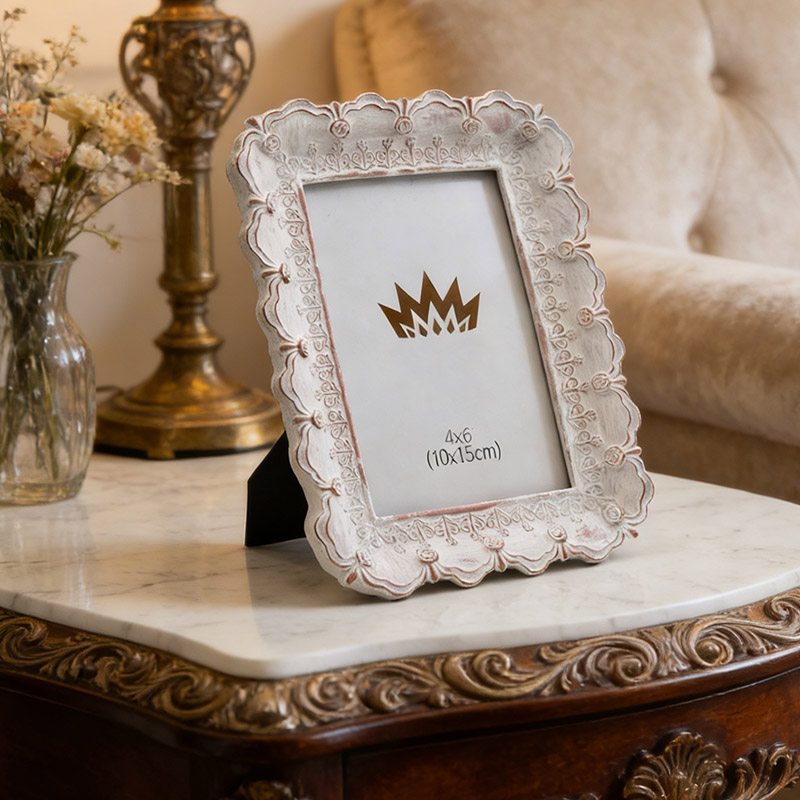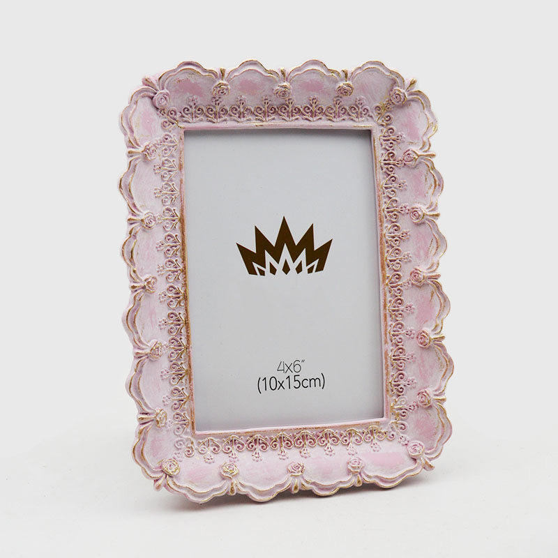 Κορνίζα φωτογραφιών Vintage με σκαλιστή λευκή ρητίνη 4×6 είναι κατασκευασμένο από οικολογική ρητίνη με χειροποίητη σκαλιστή και φθαρμένη κατασκευή. Το ροζ-λευκό ντεγκραντέ πλαίσιο είναι διακοσμημένο με εξαιρετικά σχέδια κύλισης και στέμματος,
