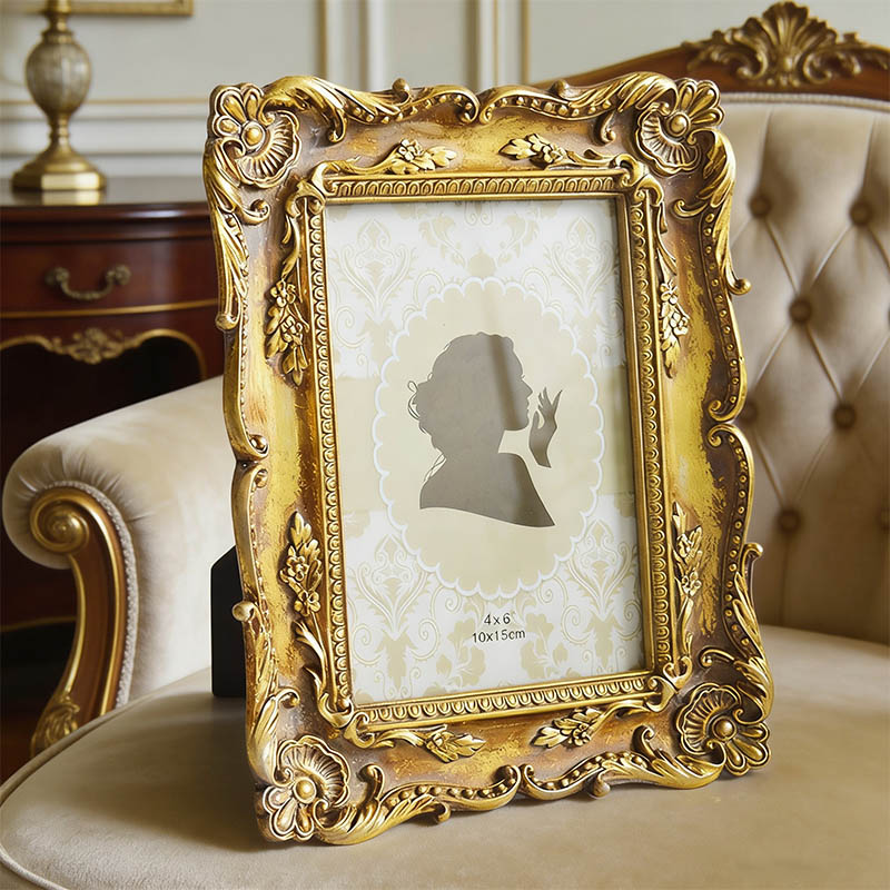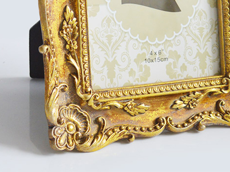 Η κορνίζα φωτογραφιών από ρητίνη 4×6 ιντσών διαθέτει μια ελαφριά, πολυτελή ρετρό αισθητική.Το χρυσό χαραγμένο περίγραμμα συνδυάζει την ανάγλυφη δεξιοτεχνία με εκλεπτυσμένες υφές και μια πλούσια αίσθηση βάθους.