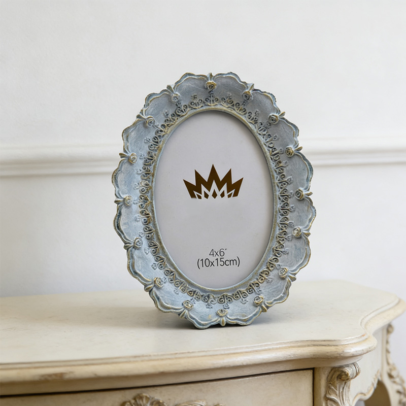 Παρέχουμε κορνίζες φωτογραφιών υψηλής ποιότητας από πολυρεζίνη με vintage μπαρόκ σχέδιο. Αυτό το μοντέλο 1789 διαθέτει χειροποίητο αντικέ μπλε και χρυσό φινίρισμα, κατάλληλο για καταστήματα λιανικής πώλησης ειδών διακόσμησης σπιτιού, καταστήματα δώρων και διανομείς ειδών γάμου. Το προϊόν συνδυάζει ανθεκτική κατασκευή από ρητίνη με πραγματική γυάλινη πρόσοψη, εξασφαλίζοντας υψηλή αντιληπτή αξία για τους τελικούς πελάτες σας.
