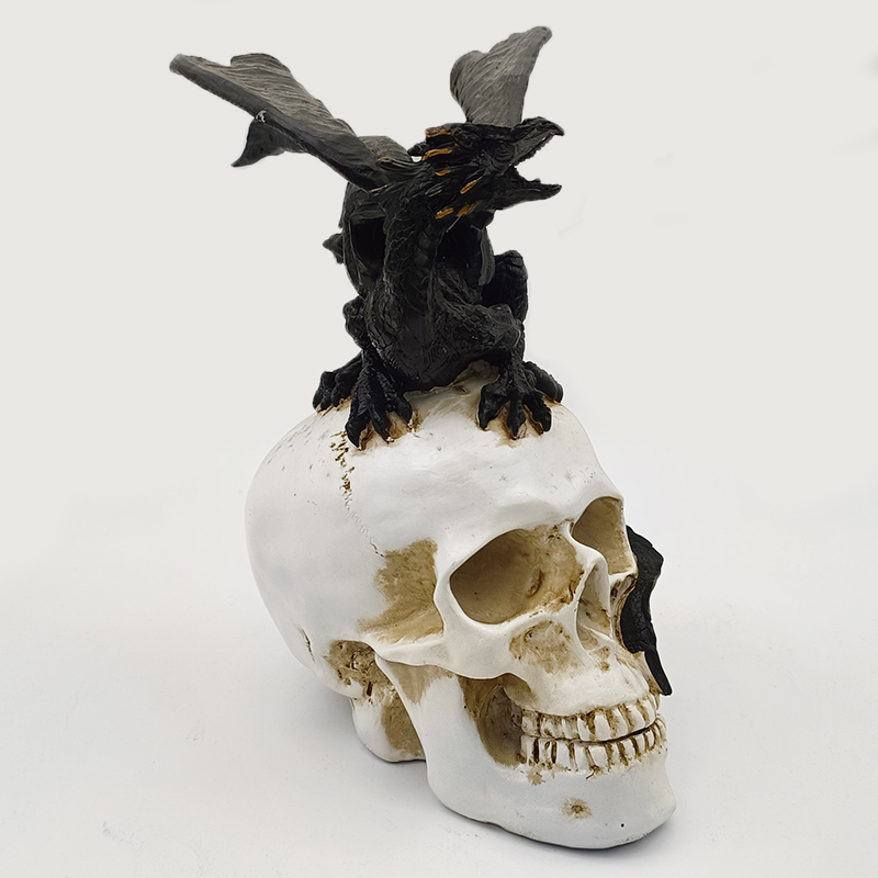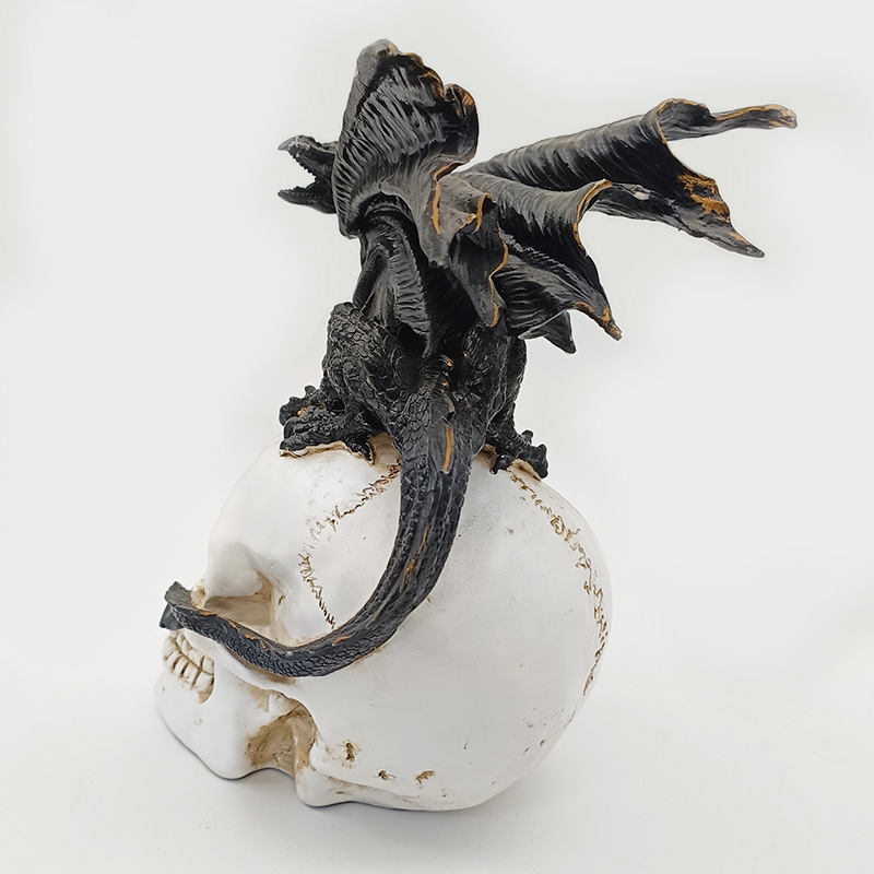 Αυτό το ειδώλιο ρητίνης βασίζεται στις αναλογίες ενός πραγματικού ανθρώπινου κρανίου, σε συνδυασμό με την επιβλητική εικόνα ενός μαύρου δράκου, δημιουργώντας μια εξαιρετικά δυναμική και σκοτεινή αισθητική φαντασίας.