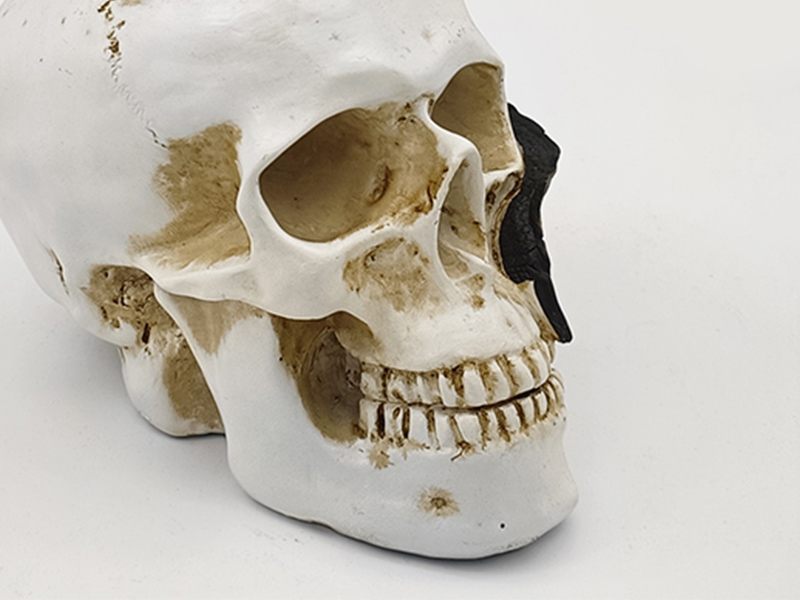 Οι οφθαλμικές κόγχες, η ρινική κοιλότητα, τα δόντια και άλλες οστικές δομές στο κρανίο απεικονίζονται με σαφήνεια, με τα περιγράμματα να αντικατοπτρίζουν με ακρίβεια τις αναλογίες ενός πραγματικού ανθρώπινου κρανίου. Η υφή είναι λεπτή και έχει φυσικό ματ φινίρισμα.