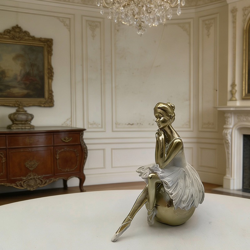 Υλικά και χειροτεχνία: Το κυρίως σώμα είναι κατασκευασμένο από ρητίνη, με λεία, ματ και γυαλιστερή υφή στην επιφάνεια. Το δέρμα της χορεύτριας και το μέρος της σφαίρας έχουν μεταλλική υφή σε χρώμα σαμπάνιας/ανοιχτό χρυσό, η φούστα και τα παπούτσια μπαλέτου είναι σε απαλό ροζ χρώμα.