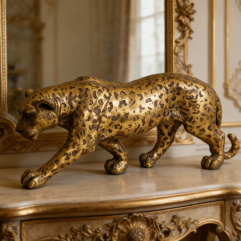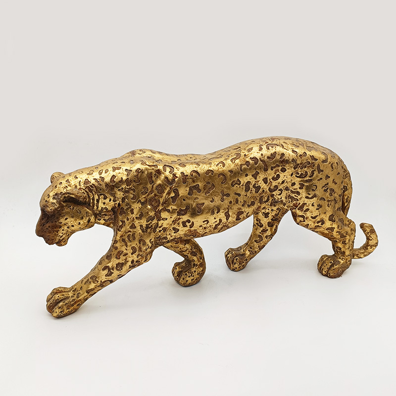 Αυτό το επιχρυσωμένο ειδώλιο τσίτα είναι σχολαστικά κατασκευασμένο με ρεαλιστικές τεχνικές, απεικονίζοντας τη δυναμική στάση του τσίτα καθώς περπατάει στα τέσσερα. Η συνολική επιφάνεια είναι καλυμμένη με στίγματα επιχρυσωμένες υφές και το ματ χρυσό φινίρισμα συνδυάζεται με μια παγωμένη μεταλλική υφή, αναδημιουργώντας την ρετρό γοητεία της τεχνητής επιχρύσωσης από χαλκό. Το ειδώλιο απεικονίζει με ακρίβεια το αεροδυναμικό σώμα και τα τεντωμένα άκρα του τσίτα, με χαμηλό καμπύλο κεφάλι και ισορροπημένη στάση, που συμπληρώνονται από λεπτομερή χαρακτηριστικά, λεπτομέρειες με νύχια και ξεχωριστά στρώματα της υφής του δέρματος της λεοπάρδαλης. Τα ανομοιόμορφα σχέδια δέρματος λεοπάρδαλης στο σώμα είναι σαφώς καθορισμένα και το ρεαλιστικό σκάλισμα των μυϊκών γραμμών δίνει σε ολόκληρη τη φιγούρα μια αίσθηση δύναμης.