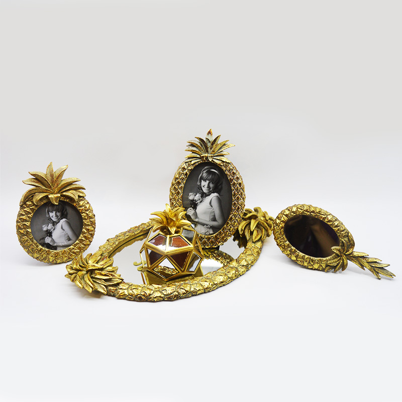 Αυτό το ρετρό ανάγλυφο ανανά με χρυσό μοτίβο αλουμινίου ο δίσκος καθρέφτη ρητίνης έχει σχεδιαστεί με πυρήνα το στυλ της ευρωπαϊκής αυλής. Οι δύο πλαϊνές λαβές σε σχήμα τρισδιάστατων λουλουδιών ανανά είναι περίτεχνα σκαλισμένες,