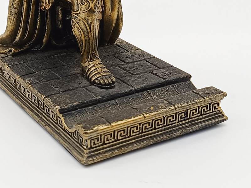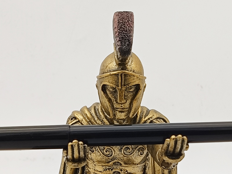 Το κύριο σώμα είναι κατασκευασμένο από ρητίνη: η επιφάνεια είναι επεξεργασμένη με αντίκα εφέ χαλκού-χρυσού, παρουσιάζοντας μια ματ μεταλλική υφή. Σε ορισμένες περιοχές (όπως το φτερό του κράνους, τα κενά στην πανοπλία) δίνεται ένα σκούρο αντίκα εφέ για να ενισχυθεί το ρετρό εφέ στρώσεων. Η βάση είναι σε απομίμηση υφής πέτρας και οι άκρες είναι διακοσμημένες με ελληνικά μοτίβα σε σχήμα κύλισης, προσθέτοντας μια πινελιά κλασικής γοητείας.